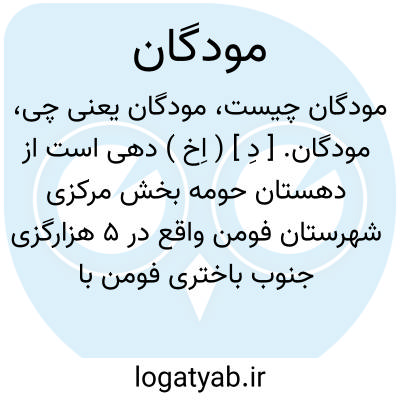 مودگان. [ دِ ] ( اِخ ) دهی است از دهستان حومه بخش مرکزی شهرستان فومن واقع در 5 هزارگزی جنوب باختری فومن با 149 تن سکنه. آب آن از چاه و راه آن مالرو است. عده ای در تابستان به ییلاق می روند. ( از فرهنگ جغرافیائی ایران ج 2 ).
