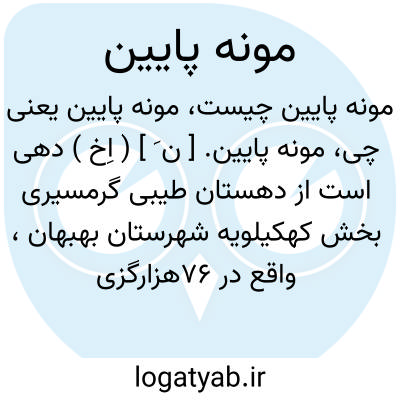 مونه پایین. [ ن َ ] ( اِخ ) دهی است از دهستان طیبی گرمسیری بخش کهکیلویه شهرستان بهبهان، واقع در 76هزارگزی شمال راه شوسه بهبهان با 350 تن سکنه. راه آن مالرو است. ساکنان از طایفه طیبی هستند. ( از فرهنگ جغرافیائی ایران ج 6 ).