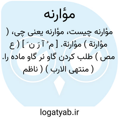 ( مؤارنة ) مؤارنة. [ م ُ آ رَ ن َ ] ( ع مص ) طلب کردن گاو نر گاو ماده را. ( منتهی الارب ) ( ناظم الاطباء ) ( آنندراج ). || مفاخرت نمودن با کسی. ( منتهی الارب ). مفاخره کردن. ( از آنندراج ).