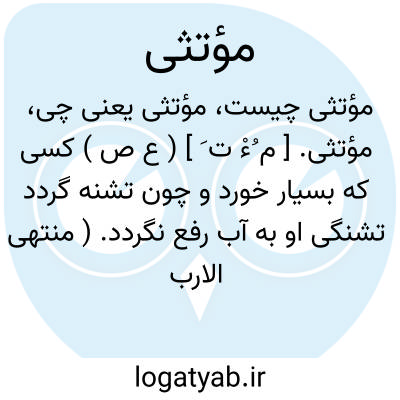 مؤتثی. [ م ُءْ ت َ ] ( ع ص ) کسی که بسیار خورد و چون تشنه گردد تشنگی او به آب رفع نگردد. ( منتهی الارب ماده اث ی ). آن که به علت بسیار خوردن طعام تشنگی او به آب رفع نشود. ( از آنندراج ). کسی که بسیار خورده و تشنه شود و هرچه آب خورد سیراب نگردد. ( ناظم الاطباء ).