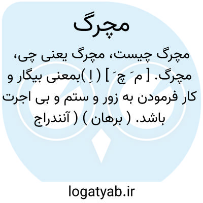 لغت نامه دهخدا مچرگ. [ م َ چ َ ] ( اِ )بمعنی بیگار و کار فرمودن به زور و ستم و بی اجرت باشد. ( برهان ) ( آنندراج ). بیگار و کارفرمایی به زور و بی مزد و اجرت. ( ناظم الاطباء ). و رجوع به مجرگ شود.