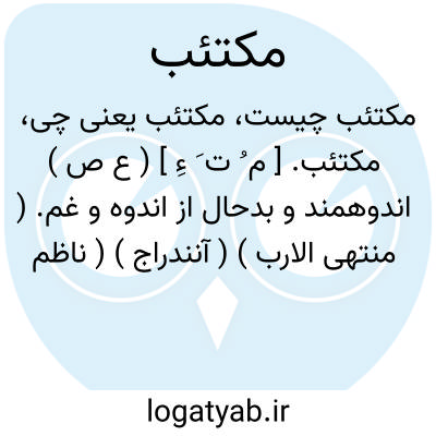 مکتئب. [ م ُ ت َ ءِ ] ( ع ص ) اندوهمند و بدحال از اندوه و غم. ( منتهی الارب ) ( آنندراج ) ( ناظم الاطباء ) ( از اقرب الموارد ). کئیب. ( یادداشت به خط مرحوم دهخدا ). || رماد مکتئب، ریگ مایل به سیاهی همچو رخ غمناکان. ( منتهی الارب ) ( آنندراج ). خاکستر مایل به سیاهی. ( ناظم الاطباء ). خاکستری که به سیاهی زند مانند چهره اندوهناکان، و عبارت صحاح چنین است: رماد مکتئب اللون. ( از اقرب الموارد ).