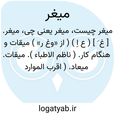 میغر. [ غ َ ] ( ع اِ ) ( از «وغ ر» ) میقات و هنگام کار. ( ناظم الاطباء ). میقات. میعاد. ( اقرب الموارد ). وعده جای و وعده گاه. ( ناظم الاطباء ). میغرة. || جای کار. ( ناظم الاطباء ). میغرة. رجوع به میغرة شود.