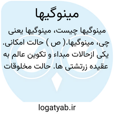 مینوگیها.( ص ) حالت امکانی. یکی ازحالات مبداء و تکوین عالم به عقیده زرتشتی ها. حالت مخلوقات اورمزد در سه هزار سال اول از 12000 سال عمرخلقت عالم. ( از ایران در زمان ساسانیان چ 2 ص 168 ). در آغاز کار جهان به حالت مینوگیها یعنی امکانی بود.در این دوره فقط زروان یا زمان یا قضا وجود بالفعل داشت. ( ایران در زمان ساسانیان چ امیر مکری ص 174 ).