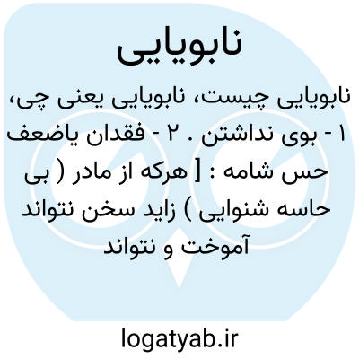 ۱ - بوی نداشتن. ۲ - فقدان یاضعف حس شامه: [ هرکه از مادر ( بی حاسه شنوایی ) زاید سخن نتواند آموخت و نتواند گفت ولال بماند و از نابینایی و نابویایی این نقصان نباشد.]