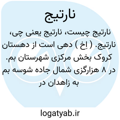 نارتیج. ( اِخ ) دهی است از دهستان کروک بخش مرکزی شهرستان بم. در 8 هزارگزی شمال جاده شوسه بم به زاهدان در جلگه گرمسیر مالاریاخیزی واقع است. 210 تن سکنه دارد، آبش از قنات و محصولش غلات و خرما و حنا و لبنیات است و شغل مردمش زراعت و گله داری است. راه فرعی دارد. ( از فرهنگ جغرافیایی ایران ج 8 ص 406 ).