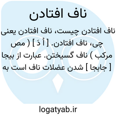 ناف افتادن. [ اُ دَ ] ( مص مرکب ) ناف گسیختن. عبارت از بیجا [ جابجا ] شدن عضلات ناف است به سبب برداشتن بارسنگین یا زور کردن زیاده از مقدور یا خوف عظیم خوردن که رنگ را زرد کند و اطلاق آن بر آدم و غیر آدم هم آید چون بار بسیار بر پشت اشتر و قاطر اندازند گویندچنان می کند که نافش بیفتد و این را به تازی سقوطالسرة گویند. ( از فرهنگ نظام از بهار عجم ) ( آنندراج ).