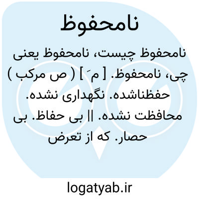 نامحفوظ. [ م َ ] ( ص مرکب ) حفظناشده. نگهداری نشده. محافظت نشده. || بی حفاظ. بی حصار. که از تعرض دیگران و چشم انداز رهگذران مصون و محفوظ و پوشیده نیست.