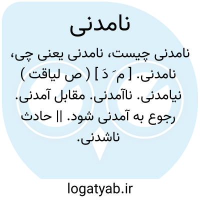 نامدنی. [ م َ دَ ] ( ص لیاقت ) نیامدنی. ناآمدنی. مقابل آمدنی. رجوع به آمدنی شود. || حادث ناشدنی. ناممکن. واقعنشدنی.
