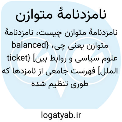فرهنگستان زبان و ادب {balanced ticket} [علوم سیاسی و روابط بین الملل] فهرست جامعی از نامزدها که طوری تنظیم شده باشد که در آن طیف وسیعی از شرکت کنندگان با توجه به ملاحظات قومی و جغرافیایی و جنسیتی بیشترین بخت را برای کسب آرا داشته باشند