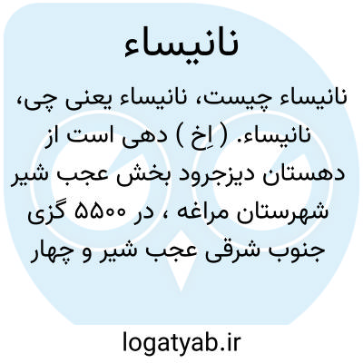 نانیساء. ( اِخ ) دهی است از دهستان دیزجرود بخش عجب شیر شهرستان مراغه، در 5500 گزی جنوب شرقی عجب شیر و چهار هزارگزی مغرب جاده شوسه مراغه به دهخوارقان. در جلگه معتدل هوائی واقع است و 409 تن سکنه دارد. آبش از رودخانه قلعه چای و نیز از چاه تأمین می شود. محصولش غلات، کشمش و بادام و شغل مردمش زراعت است. راه مالرو است. ( از فرهنگ جغرافیایی ایران ج 4 ).