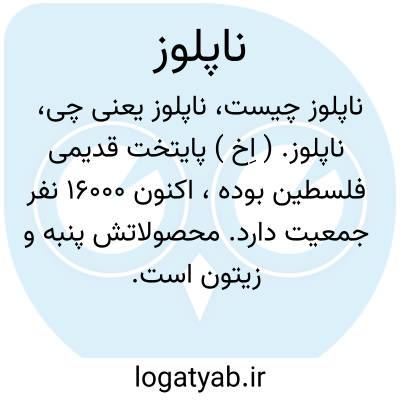 لغت نامه دهخدا ناپلوز. ( اِخ ) پایتخت قدیمی فلسطین بوده، اکنون 16000 نفر جمعیت دارد. محصولاتش پنبه و زیتون است.