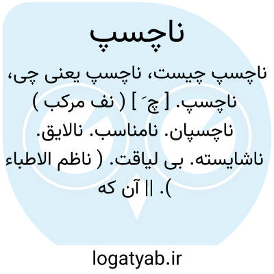 ناچسپ. [ چ َ ] ( نف مرکب ) ناچسپان. نامناسب. نالایق. ناشایسته. بی لیاقت. ( ناظم الاطباء ). || آن که هماهنگی ندارد. آن که با تو سازواری ندارد.