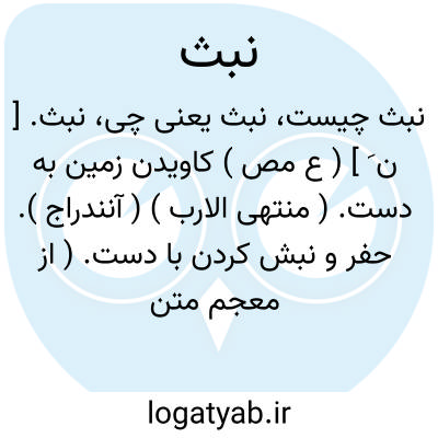 نبث. [ ن َ ] ( ع مص ) کاویدن زمین به دست. ( منتهی الارب ) ( آنندراج ). حفر و نبش کردن با دست. ( از معجم متن اللغة ). || کاویدن و برآوردن خاک از چاه. ( از اقرب الموارد ). کندن چاه و برآوردن خاک آن. ( از المنجد ). || بیرون آوردن خاک از چاه و غیر آن. ( از المنجد ): نبث التراب؛ خارج کرد آن را از نهر یا از چاه. ( معجم متن اللغة ) ( اقرب الموارد ). چاه پاک کردن. ( المصادر زوزنی ) ( تاج المصادر بیهقی ). || واکردن چیزی پنهان را. ( منتهی الارب ) ( ناظم الاطباء ) ( آنندراج ) ( از المنجد ). || جستجو. تجسس: نبث عن الامر؛ بحث. ( معجم متن اللغة ). بحث عنه، و هو مستعار من نبث البئر. ( اقرب الموارد ). گویند: فلان ینبث عن عیوب الناس؛ یظهرها؛ برملا می کند آن را. ( از المنجد ). || خشم گرفتن. ( منتهی الارب ) ( آنندراج ). غضب کردن. ( از معجم متن اللغة ) ( از اقرب الموارد ) ( از المنجد ). || تره برکندن. ( منتهی الارب ) ( ناظم الاطباء ) ( آنندراج ).