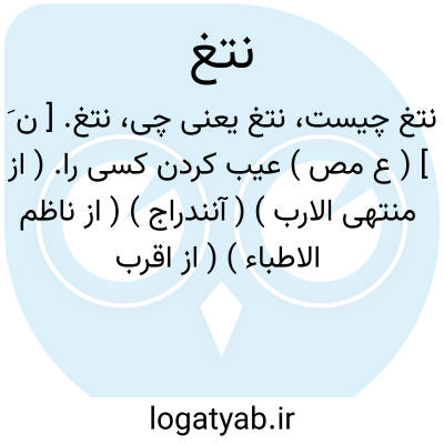 نتغ. [ ن َ ] ( ع مص ) عیب کردن کسی را. ( از منتهی الارب ) ( آنندراج ) ( از ناظم الاطباء ) ( از اقرب الموارد ) ( از معجم متن اللغة ) ( از المنجد ). || گفتن در حق کسی چیزی که نباشد در وی. ( منتهی الارب ) ( آنندراج ) ( از معجم متن اللغة ). غیبت کردن کسی را و گفتن در حق او آنچه در وی نبوده. ( از المنجد ). || خندیدن. خندیدنی به استهزاء، یا برخی از خنده خود را نهفتن و برخی را نمودن. ( از معجم متن اللغة ). به تمسخر لبخند زدن. پوزخند زدن.
