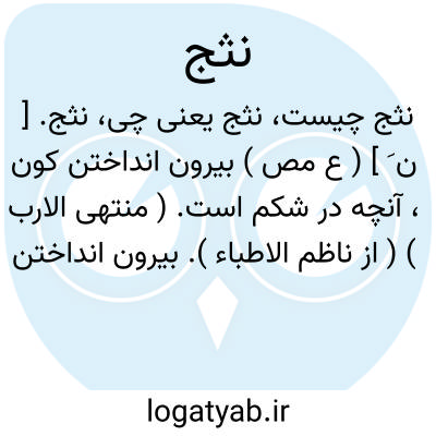 نثج. [ ن َ ] ( ع مص ) بیرون انداختن کون، آنچه در شکم است. ( منتهی الارب ) ( از ناظم الاطباء ). بیرون انداختن آنچه در شکم دارد. ( از اقرب الموارد ). گویند: نثج استه نثجاً. || نثج بطنه بالسکین؛ به دشنه پاره کرد شکم او را. ( منتهی الارب ) ( از ناظم الاطباء ) ( از اقرب الموارد ).