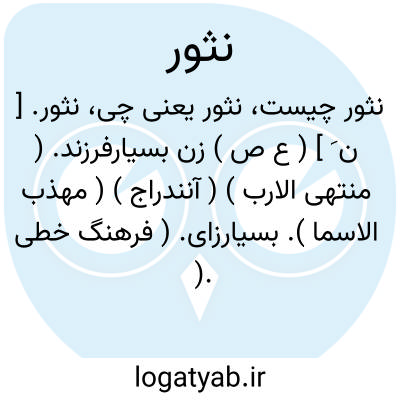 نثور. [ ن َ ] ( ع ص ) زن بسیارفرزند. ( منتهی الارب ) ( آنندراج ) ( مهذب الاسما ). بسیارزای. ( فرهنگ خطی ). کثیرالولد و کثیرةالولد. ( اقرب الموارد ). بسیار زاینده. ( دهار ). || زن گشاده سوراخ پستان.( منتهی الارب ) ( آنندراج ). گوسپندی که سوراخ پستانش گشاده باشد. ( ناظم الاطباء ). || گوسپندی که از بینی اش کرم مانندی برآید. ( منتهی الارب ) ( آنندراج ) ( از اقرب الموارد ). || داروی سوده خشک که بر خستگیها پاشند. ادویه مسحوقه یابسه که بر جراحات و درون پلک پاشند. ج، نثورات. ( یادداشت مؤلف ).