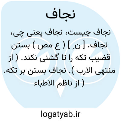 نجاف. [ ن ِ ] ( ع مص ) بستن قضیب تکه را تا گشنی نکند. ( از منتهی الارب ). نجاف بستن بر تکه. ( از ناظم الاطباء ). قضیب تیس بستن تا گشنی نتواند کردن. ( تاج المصادر بیهقی ). || ( اِ ) دوالی است که مابین قضیب و شکم تکه بندند تا گشنی کردن تواند. ( منتهی الارب ) ( آنندراج ) ( ناظم الاطباء ). و یا آنکه قضیب آن را با پای وی و یا با پشت آن بندند. ( ناظم الاطباء ). || مدرعه.( اقرب الموارد ) ( منتهی الارب ) ( آنندراج ) ( ناظم الاطباء ). جامه ای است پشمی. ( از منتهی الارب ) ( آنندراج ). جامه پشمین. ( ناظم الاطباء ). || پاشنه زبرین در. ( مهذب الاسماء ). پاشنه در، یا آنچه پیش در باشد از آستانه بالائین، یا آن دربند است. ( منتهی الارب )( آنندراج ). آنچه بنا شده باشد به صورتی برآمده بر بالای در، یا مشرف بر آن. ( از المنجد ). اسکفة الباب اودروند الباب، و فی الاساس: علی بابه نجاف و هو ما بنی ناتئاً فوق الباب مشرفاً علیه کنجاف الغار. ( اقرب الموارد ). || نجاف غار؛ صخره برآمده مشرف بر آن. ( از اقرب الموارد ) ( از المنجد ). || ج ِ نَجَف. ( از اقرب الموارد ). رجوع به نجف شود.