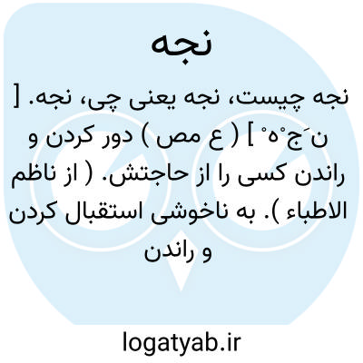 نجه. [ ن َج ْه ْ ] ( ع مص ) دور کردن و راندن کسی را از حاجتش. ( از ناظم الاطباء ). به ناخوشی استقبال کردن و راندن کسی را از حاجتش، یا به زشت ترین وجهی رد کردن کسی را. ( از المنجد ) ( از اقرب الموارد ). راندن. ( یادداشت مؤلف ). و فی الحدیث: بعدما نجهها عمر؛ یعنی پس از آنکه راند او را و بانگ زد بر وی. ( از اقرب الموارد ). دورکردگی. راندگی. زجر. ردع. ( ناظم الاطباء ). || بازداشتن. ( یادداشت مؤلف ). || برآمدن بر قومی. ( از ناظم الاطبا ) ( از المنجد ). طالع شدن. ( از اقرب الموارد ). || داخل شدن در شهری و خوش نداشتن آن را.( از اقرب الموارد ) ( از ناظم الاطباء ) ( از المنجد ).