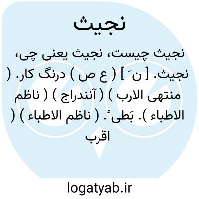 نجیث. [ ن َ ] ( ع ص ) درنگ کار. ( منتهی الارب ) ( آنندراج ) ( ناظم الاطباء ). بَطی ٔ. ( ناظم الاطباء ) ( اقرب الموارد ). سست. || ( اِ ) راز نهانی. ( منتهی الارب ) ( آنندراج ). راز نهفته. ( ناظم الاطباء ). سرّ مختفی. ( اقرب الموارد ). || نشانه خاکین که خاک توده گویند. ( منتهی الارب ). ریگ توده ای که بر نشانه تیر سازند. ( ناظم الاطباء ).هدف، و آن خاکی است که توده کنند. ( اقرب الموارد ). || تره. ( منتهی الارب ) ( آنندراج ). تره ای است. ( اقرب الموارد ). نام تره ای است. ( ناظم الاطباء ).