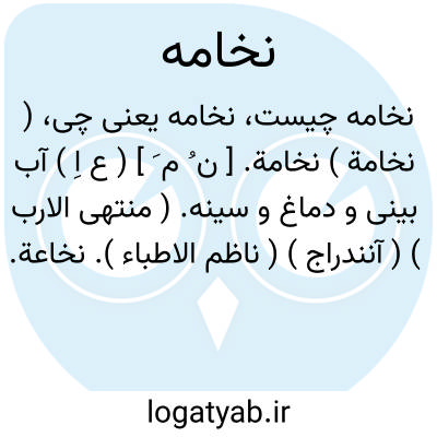 ( نخامة ) نخامة. [ ن ُ م َ ] ( ع اِ ) آب بینی و دماغ و سینه. ( منتهی الارب ) ( آنندراج ) ( ناظم الاطباء ). نخاعة. ( اقرب الموارد ) ( ناظم الاطباء ). خلط دماغ و سینه. ( فرهنگ خطی ). بلغم. ( دهار ). بلغم که از گلو برآید. ( فرهنگ خطی ). خیو که بیندازند از دهن. ( یادداشت مؤلف ).