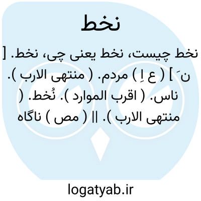 نخط. [ ن ُ ] ( ع اِ ) مغز مهره پشت. حرام مغز. ( منتهی الارب ) ( آنندراج ). نخاع. ( ناظم الاطباء ) ( اقرب الموارد )( المنجد ) ( آنندراج ) ( ناظم الاطباء ). || آبی که در مشیمه است. ( از اقرب الموارد ) ( از المنجد ). آب که با بچه بیرون آید. ( مهذب الاسما ). || مردم. نَخْط. ( منتهی الارب ) ( ناظم الاطباء ) ( آنندراج ). ناس. ( اقرب الموارد ). یقال: ماادری ای النخط هو ( منتهی الارب )؛ ندانم چه مردم است او. ( مهذب الاسما ).
