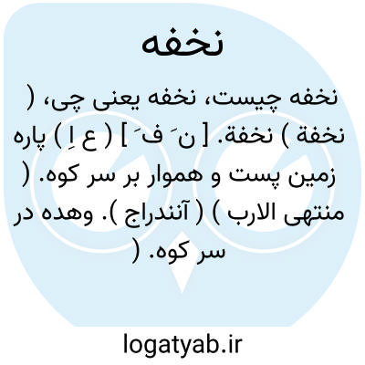 ( نخفة ) نخفة. [ ن َ ف َ ] ( ع اِ ) پاره زمین پست و هموار بر سر کوه. ( منتهی الارب ) ( آنندراج ). وهده در سر کوه. ( از اقرب الموارد ). زمین پست و هموار دور کوه. ( ناظم الاطباء ).