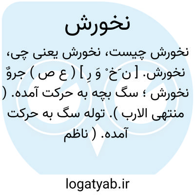 نخورش. [ ن َخ ْ وَ رِ ] ( ع ص ) جروٌ نخورش؛ سگ بچه به حرکت آمده. ( منتهی الارب ). توله سگ به حرکت آمده. ( ناظم الاطباء ) ( اقرب الموارد ). || کلب نخورش؛ سگ بسیارخارش، یا آن خبیث مقاتل است. ( منتهی الارب ) ( از اقرب الموارد ). سگ جنگجو. ( ناظم الاطباء ).