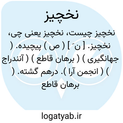 لغت نامه دهخدا نخچیز. [ ن َ ] ( ص ) پیچیده. ( جهانگیری ) ( برهان قاطع ) ( آنندراج ) ( انجمن آرا ). درهم گشته. ( برهان قاطع ). نوردیده. ( فرهنگ خطی ): به جامه خواب راگلبیز بوده به شب تا صبح را نخچیز بوده ( ؟ ).میرنظمی ( از شعوری ).