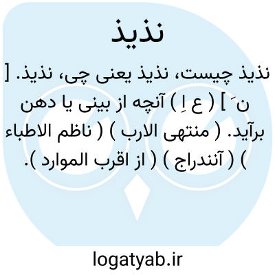 نذیذ. [ ن َ ] ( ع اِ ) آنچه از بینی یا دهن برآید. ( منتهی الارب ) ( ناظم الاطباء ) ( آنندراج ) ( از اقرب الموارد ). || ( مص ) کمیز انداختن و شاشیدن. ( آنندراج ) ( از منتهی الارب ) ( از ناظم الاطباء ). شاشیدن یا بیرون آمدن نذیذ. ( المنجد ).