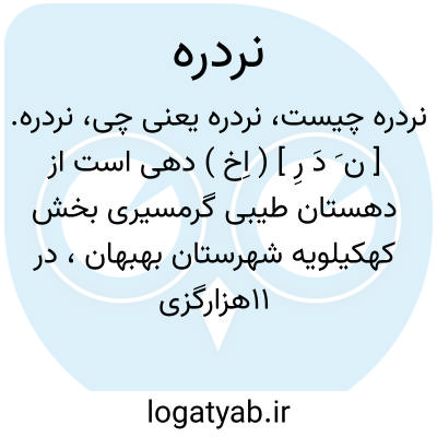 نردره. [ ن َ دَ رِ ] ( اِخ ) دهی است از دهستان طیبی گرمسیری بخش کهکیلویه شهرستان بهبهان، در 11هزارگزی جنوب غربی لنده مرکز دهستان و 78هزارگزی شمال راه بهبهان، در منطقه کوهستانی گرمسیری واقع است و 200 تن سکنه دارد. آبش از چشمه، محصولش غلات و پشم و لبنیات، شغل اهالی زراعت و حشم داری و بافتن قالیچه و جوال و گلیم است. ( از فرهنگ جغرافیایی ایران ج 6 ).