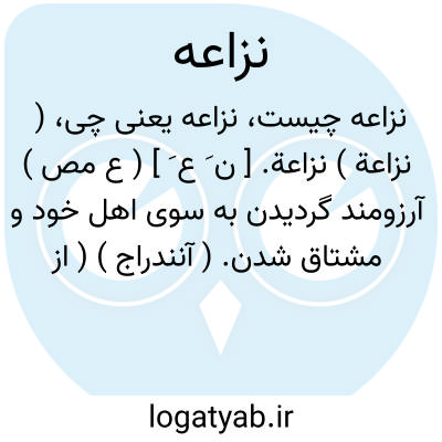 ( نزاعة ) نزاعة. [ ن َ ع َ ] ( ع مص ) آرزومند گردیدن به سوی اهل خود و مشتاق شدن. ( آنندراج ) ( از منتهی الارب ). نزاع. نزوع. رجوع به نزاع شود. || ( اِمص ) خصومة. ( اقرب الموارد ) ( مهذب الاسماء ) ( المنجد ). خصومت در حقی: بینهم نزاعة؛ خصومة فی حق. ( اقرب الموارد ).