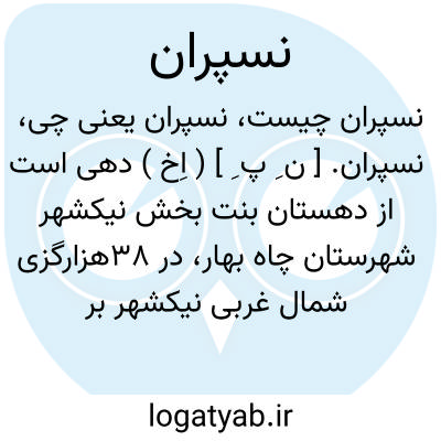 نسپران. [ ن ِ پ ِ ] ( اِخ ) دهی است از دهستان بنت بخش نیکشهر شهرستان چاه بهار، در 38هزارگزی شمال غربی نیکشهر بر کنار راه هیچان به بنت در منطقه کوهستانی گرمسیری واقع است و 350 تن سکنه دارد. آبش از رودخانه، محصولش خرما و برنج و لبنیات، شغل اهالی زراعت و گله داری است. ( از فرهنگ جغرافیایی ایران ج 8 ).