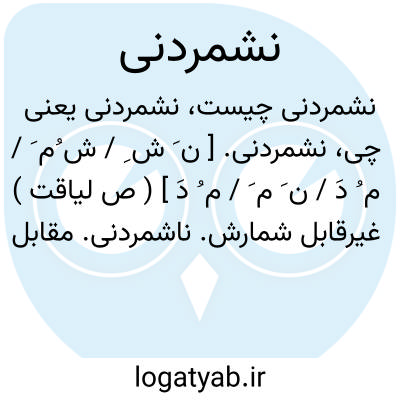 نشمردنی. [ ن َ ش ِ / ش ُم َ / م ُ دَ / ن َ م َ / م ُ دَ ] ( ص لیاقت ) غیرقابل شمارش. ناشمردنی. مقابل شمردنی. رجوع به شمردنی شود.