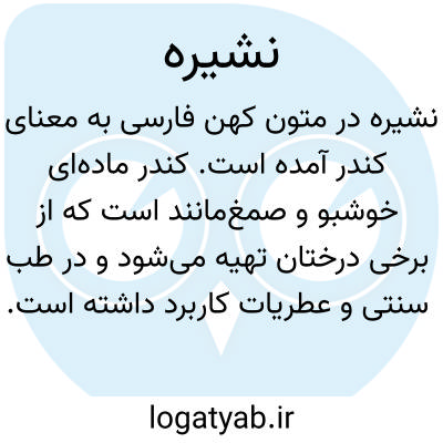 واژه «نشیره» در متون کهن فارسی به معنای کندر آمده است. کندر ماده‌ای خوشبو و صمغ‌مانند است که از برخی درختان تهیه می‌شود و در طب سنتی و عطریات کاربرد داشته است. منابعی مانند ناظم الاطباء و نیز کتاب اشتینگاس به این معنا اشاره کرده‌اند و این واژه را به عنوان نام رایج کندر در متون پزشکی و طبیعیات ذکر کرده‌اند.
