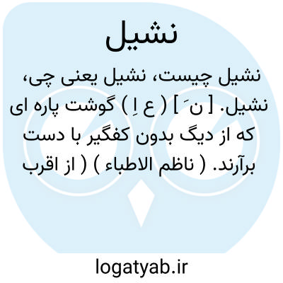 نشیل. [ ن َ ] ( ع اِ ) گوشت پاره ای که از دیگ بدون کفگیر با دست برآرند. ( ناظم الاطباء ) ( از اقرب الموارد ) ( از المنجد ). گوشت پاره ای که از دیگ به یک کفگیر [ ؟ ] به دست برگیرند. ( منتهی الارب ) ( آنندراج ). || گوشت بی توابل پخته. ( منتهی الارب ) ( آنندراج ) ( از اقرب الموارد ) ( از ناظم الاطباء ) ( از المنجد ) ( از متن اللغة ).گوشت که پزند بی توابل. ( مهذب الاسماء ). گوذآب. جوذاب.و آن چیزی باشد که بپزند بی توابل. ( یادداشت مؤلف ). || شیر در هنگام دوشیدن. ( از منتهی الارب )( از آنندراج ) ( از اقرب الموارد ) ( از ناظم الاطباء ) ( از المنجد ) ( از متن اللغة ). || تیغ سبک تنک. ( منتهی الارب ) ( از آنندراج ) ( ناظم الاطباء ). شمشیر خفیف رقیق. ( از اقرب الموارد ) ( از المنجد ) ( از متن اللغة ). || آب که نخستین از چاه برآرند. ( منتهی الارب ) ( آنندراج ) ( از ناظم الاطباء ) ( از المنجد ).