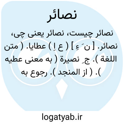 نصائر. [ ن َ ءِ ] ( ع اِ ) عطایا. ( متن اللغة ). ج ِ نصیرة ( به معنی عطیه ). ( از المنجد ). رجوع به نصیرة شود. || ج ِ نصیرة ( تأنیث نصیر به معنی ناصر ). ( از المنجد ). رجوع به نصیر و نصیرة شود.