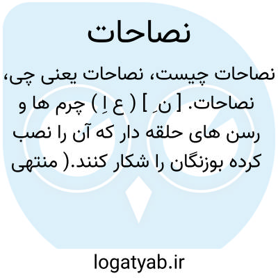 نصاحات. [ ن ِ ] ( ع اِ ) چرم ها و رسن های حلقه دار که آن را نصب کرده بوزنگان را شکار کنند.( منتهی الارب ) ( آنندراج ) ( از متن اللغة ) ( ناظم الاطباء ) ( از المنجد ). مفرد آن نِصاحِة است. || جلدها. جلود. ( از متن اللغة ). پوستها، که دوخته می شود بعض آن بر دیگری. واحد آن نصاحة است. ( از المنجد ).