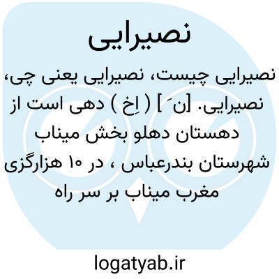 نصیرایی. [ن َ ] ( اِخ ) دهی است از دهستان دهلو بخش میناب شهرستان بندرعباس، در 10 هزارگزی مغرب میناب بر سر راه میناب به بندرعباس، در جلگه گرمسیری واقع است و 800 تن سکنه دارد. آبش از رودخانه، محصولش خرما، شغل اهالی زراعت است. ( از فرهنگ جغرافیایی ایران ج 8 ص 411 ).