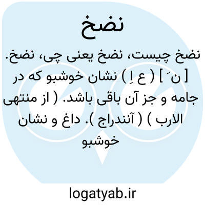 نضخ. [ ن َ ] ( ع اِ ) نشان خوشبو که در جامه و جز آن باقی باشد. ( از منتهی الارب ) ( آنندراج ). داغ و نشان خوشبو که در جامه باقی ماند. ( ناظم الاطباء ). اثری که از طیب در جامه و جز آن باقی ماند. ( از اقرب الموارد ) ( از المنجد ) ( از متن اللغة ). || ( مص ) پاشیدن آب را. ( از منتهی الارب ) ( آنندراج ). نضخان. ( ناظم الاطباء ). نضح. ( اقرب الموارد ) ( متن اللغة ). رجوع به نَضح معجم متن اللغة شود. || نیم سیر شدن از آب. ( از منتهی الارب ) ( آنندراج ). و بدین معنی از آن نه فعل صرف می شود و نه اسم فاعل. ( از ناظم الاطباء ). || سخت جوشیدن آب از چشمه یا از زیر بالا رفتن. ( آنندراج ) ( از منتهی الارب ). آب از چشمه برجوشیدن. ( فرهنگ خطی ). سخت جوشیدن آب از چشمه و گفته اند از پائین به بالا جهیدن آن. ( از اقرب الموارد ). نضخان. ( المنجد ) ( اقرب الموارد ) ( ناظم الاطباء ). || پراکنده افکندن تیر در دشمن. ( از منتهی الارب ) ( آنندراج ). تیر را در [ سپاه ] دشمن پراکندن. ( از المنجد ) ( از اقرب الموارد ). نضخ النبل و نضخ به فی العدو؛ فرقها فیهم. ( اقرب الموارد ) ( متن اللغة ). نضخان. ( اقرب الموارد ) ( ناظم الاطباء ).