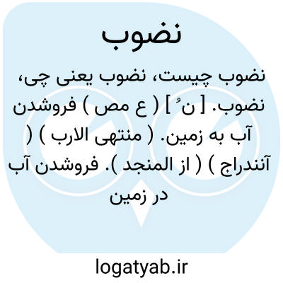 نضوب. [ ن ُ ] ( ع مص ) فروشدن آب به زمین. ( منتهی الارب ) ( آنندراج ) ( از المنجد ). فروشدن آب در زمین و پائین رفتن. ( از ناظم الاطباء ) ( از اقرب الموارد ). آب به زمین فروخوردن. ( تاج المصادر بیهقی ) ( از زوزنی ). فرورفتن آب در زمین و تمام شدن. ( از متن اللغة ). نزح. نشف. ( از اقرب الموارد ). || فرورفتن چشم در مغاک، یا بخصوص چشم ناقه. ( منتهی الارب ) ( آنندراج ) ( از ناظم الاطباء ) ( از اقرب الموارد ) ( از متن اللغة ). به گودی رفتن چشم. دور شدن. ( از منتهی الارب ) ( از ناظم الاطباء ) ( از اقرب الموارد ) ( از المنجد ) ( از متن اللغة ). دور شدن دشت و مردم. ( آنندراج ). گویند: نضبت المفازة و نضبوا؛ ای بعدت و بعدوا. ( منتهی الارب ). || غایب شدن. ( از اقرب الموارد ). نضب الخیر؛ غاب. ( اقرب الموارد ). || مردن. ( منتهی الارب ) ( از آنندراج ) ( ناظم الاطباء ) ( از متن اللغة ). موت. ( ازاقرب الموارد ) ( از المنجد ). تمام شدن و منقضی شدن عمر. ( از متن اللغة ). || روان گردیدن. ( از منتهی الارب ) ( آنندراج ). روان شدن و جاری گشتن. ( از متن اللغة ). رجوع به نَضب شود. || کندن جامه را. ( از اقرب الموارد ) ( از متن اللغة ). || کم شدن. ( از اقرب الموارد ) ( از المنجد ). کم شدن نبات. ( از منتهی الارب ) ( آنندراج ). کم شدن گیاه. ( از ناظم الاطباء ). کم شدن و انقطاع خصب. ( از متن اللغة ). گویند: نضب الخیر قل و کذلک نضب الخصب. ( از اقرب الموارد ). || سخت شدن پشت ریش. ( منتهی الارب ) ( آنندراج ). سخت گردیدن ریش پشت. ( ناظم الاطباء ). سخت شدن اثر زخم در پشت و عمیق شدن آن. ( از اقرب الموارد ).
