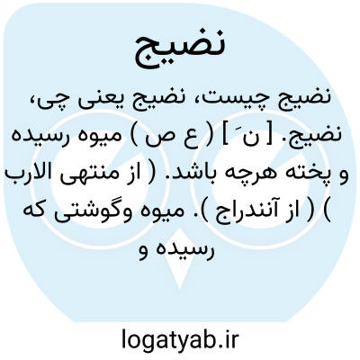 نضیج. [ ن َ ] ( ع ص ) میوه رسیده و پخته هرچه باشد. ( از منتهی الارب ) ( از آنندراج ). میوه وگوشتی که رسیده و پخته و قابل خوردن شده باشد. ناضج. ( اقرب الموارد ) ( المنجد ). میوه پخته و دمل پخته وماده پخته هر چیز که پختگی آن از آتش نباشد. ( غیاث اللغات ). رسیده. پخته. به کمال رسیده و صالح برای غایة مطلوبه شده. ( یادداشت مؤلف ). نعت است از نضج. رجوع به نَضج و نُضج شود. || نضیج الرأی؛ استوارخرد. ( آنندراج ) ( ناظم الاطباء ) ( منتهی الارب ).