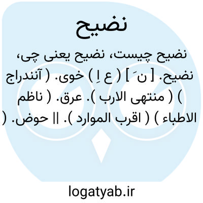 نضیح. [ ن َ ] ( ع اِ ) خوی. ( آنندراج ) ( منتهی الارب ). عرق. ( ناظم الاطباء ) ( اقرب الموارد ). || حوض. ( آنندراج ) ( ناظم الاطباء ) ( منتهی الارب ) ( از اقرب الموارد ). حوض یا حوضچه.نضح. ( از متن اللغة ). رجوع به نَضح شود. ج، نُضُح.