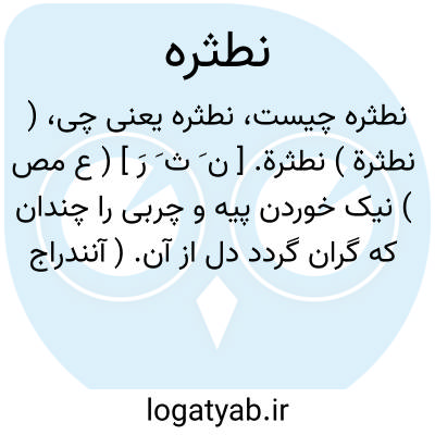 ( نطثرة ) نطثرة. [ ن َ ث َ رَ ] ( ع مص ) نیک خوردن پیه و چربی را چندان که گران گردد دل از آن. ( آنندراج )( ناظم الاطباء ) ( از منتهی الارب ). خوردن چربی بحدی که بر قلب سنگینی کند. ( از اقرب الموارد ) ( از متن اللغة ). مقلوب طنثرة است. ( از اقرب الموارد ) ( آنندراج ) ( از متن اللغة ) ( منتهی الارب ). نیز رجوع به طنثرة شود.