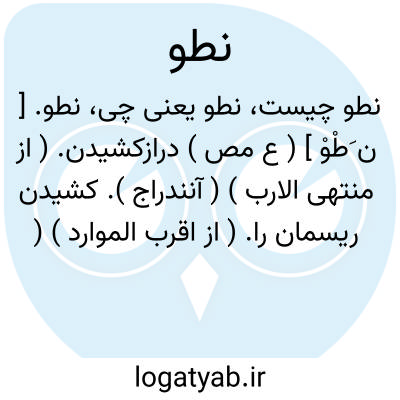 نطو. [ ن َطْوْ ] ( ع مص ) درازکشیدن. ( از منتهی الارب ) ( آنندراج ). کشیدن ریسمان را. ( از اقرب الموارد ) ( از متن اللغة ) ( از المنجد ). || تنیدن رشته را. ( آنندراج ) ( از منتهی الارب )( از ناظم الاطباء ) ( از اقرب الموارد ) ( از المنجد ) ( از متن اللغة ). فهو: ناط. ( اقرب الموارد ). و هی: ناطیة، و الغزل: منطو و نطی. ( از متن اللغة ). || دوری. ( منتهی الارب ) ( آنندراج ). دور شدن منزل. ( از اقرب الموارد ) ( از المنجد ). دور شدن کسی. ( از ناظم الاطباء ). دور شدن زمین. نطاء. فهی: نَطیَّة و المکان: نطی. و البلد: منطی. ( از متن اللغة ). || خاموشی. ( منتهی الارب ) ( آنندراج ). سکوت کردن. ( از اقرب الموارد ) ( از متن اللغة ). خاموش شدن کسی. ( از ناظم الاطباء ). نطا عنه، سکت. ( اقرب الموارد ) ( از المنجد ).