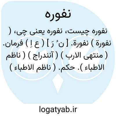 ( نفورة ) نفورة. [ ن ُ رَ ] ( ع اِ ) فرمان. ( منتهی الارب ) ( آنندراج ) ( ناظم الاطباء ). حکم. ( ناظم الاطباء ) ( اقرب الموارد ). || خویش و قریب مرد که به خشم وی خشمناک شود. ( منتهی الارب ) ( آنندراج ). نافرة. ( اقرب الموارد ). رجوع به نافرة شود.