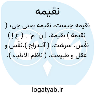 ( نقیمة ) نقیمة. [ ن َ م َ ] ( ع اِ ) نفْس. سرشت. ( آنندراج ).نفْس و عقل و طبیعت. ( ناظم الاطباء ). میمون النقیمة؛ پاک نفْس. ( منتهی الارب ). هو میمون النقیمة و النقیبة؛اذا کان مظفراً فیما یحاول. ( متن اللغة ). ابدالی است از نقیبة. ( از منتهی الارب ) ( از اقرب الموارد ). لغتی است در نقیبة. ( از متن اللغة ). رجوع به نقیبة شود.