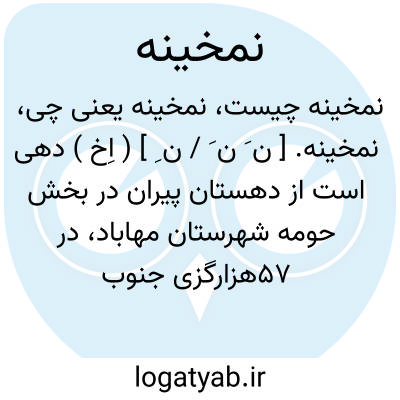 نمخینه. [ ن َ ن َ / ن ِ ] ( اِخ ) دهی است از دهستان پیران در بخش حومه شهرستان مهاباد، در 57هزارگزی جنوب غربی مهاباد واقع است و 118 تن سکنه دارد. آبش از چشمه، محصولش غلات و توتون و حبوبات، شغل اهالی زراعت و گله داری و جاجیم بافی است. ( از فرهنگ جغرافیایی ایران ج 4 ).