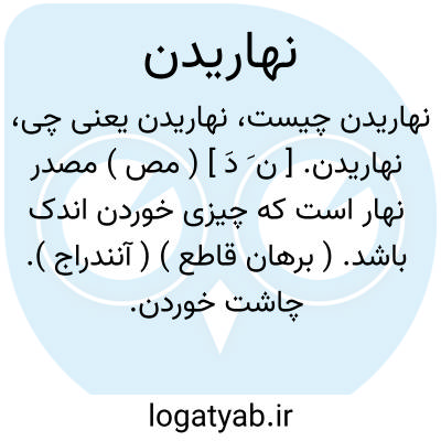 نهاریدن. [ ن َ دَ ] ( مص ) مصدر نهار است که چیزی خوردن اندک باشد. ( برهان قاطع ) ( آنندراج ). چاشت خوردن. ناهارخوردن. چیزی اندک در بامداد خوردن. ( ناظم الاطباء ).