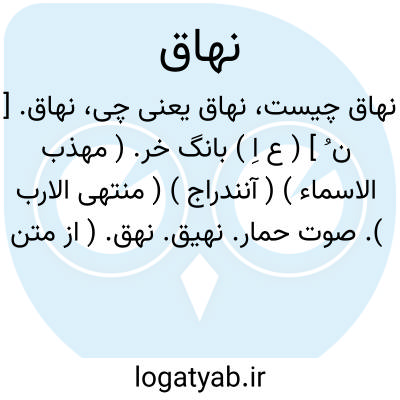 نهاق. [ ن ُ ] ( ع اِ ) بانگ خر. ( مهذب الاسماء ) ( آنندراج ) ( منتهی الارب ). صوت حمار. نهیق. نهق. ( از متن اللغة ). عرعر خر. || ( مص ) بانگ کردن خر. ( تاج المصادر بیهقی ) ( زوزنی ). نهیق. ( منتهی الارب ) ( متن اللغة ) ( اقرب الموارد ). نهق. تنهاق. ( اقرب الموارد ).
